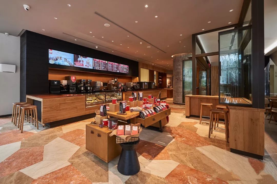 Tims店内空间开阔,整体选用了稳重的色调;