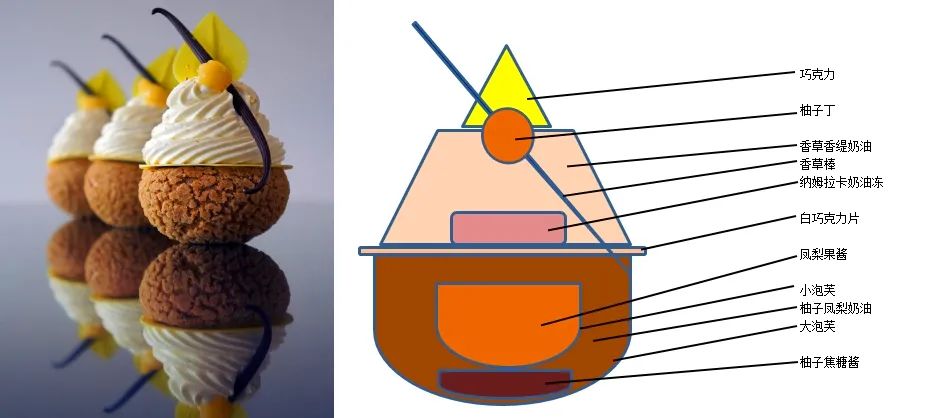 提示:↑点击上方"世界烘焙配方"快速关注cription-url="https://mmbiz.qpic.cn/mmbiz_jpg/PR7JPt3C5zawKVqAvnVjgkJkKicO3wLSfvxkngAAoDWUqJLBBmuPX3tz9EErvItMfV2IGR6HnCYhZnibRA6KM6Ww/0?wx_fmt.jpeg" data-cropselx1="0" data-cropselx2="578" data-cropsely1="0" data-cropsely2="520" data-ratio="1.249074074074074" data-s="300,640" src="http://www.yinpinjie.com/file/upload/202303/31/113828471.jpeg" data-type="jpeg" data-w="1080" />今天分享一个看似简单实则内有乾坤的泡芙吧,就是上图这个,来自巴塞罗那的chefMichel Willaume(下图)——法国里昂甜点世界杯冠军~作为一个泡芙的配方,下方看起来可能觉得有点儿繁琐甚至不知所措,简述就是大泡芙里藏着个小泡芙,各自有馅,再如图装饰就搞定啦~看到装饰上居然用了小香草棒,是不是瞬间崩溃了?自己按实际情况适当改改嘛,装饰而已不必完全一致,免得破产3urs☜今日配方下载提取码每天20:30更新,每篇文末左下角“阅读原文”点击进入均可下载当日配方、视频或图片文件,省去大家自己复制黏贴的麻烦,配方文件无任何水印设置;“提取码”因近日度娘抽风搞怪,暂不提供无码下载服务,只能按她的规矩来,所以下载之前先把这个“提取码”复制一下~另外,部分地区可能因为某些不可抗原因导致无法直接点击阅读原文,可以在文末的【置顶留言】中找到链接和提取码。西柚凤梨香草泡芙YUZU PINEAPPLE VANILLEBy Michel Willaume泡芙【1490 克】250 克【16.78%】水250 克【16.78%】牛奶200 克【13.42%】黄油300 克【20.13%】T55面粉(或中筋面粉) 10 克【 0.67%】盐 30 克【 2.01%】砂糖450 克【30.20%】全蛋制作:1、将水、牛奶、盐、砂糖和黄油放入厚底平底锅中煮沸。2、一次性倒入过筛的面粉搅拌均匀并继续大火加热搅拌使面糊水分蒸发形成面团状。3、离火,倒入搅拌机内,逐个加入全蛋搅拌。4、挤成大小两种规格的泡芙。5、入烤箱以180℃烘烤10分钟(关闭风门),然后降温至160℃烘烤至完成(打开风门)。泡芙酥皮(510 克)150 克【29.41%】黄油180 克【35.29%】赤砂糖/黄砂糖180 克【35.29%】T55面粉(或中筋面粉)制作:1、将全部材料混合呈均匀面团状。2、擀压至2毫米厚度,裁切为与泡芙同直径的圆片。3、烘烤前,放在待烤的泡芙顶部。柚子焦糖酱【461 克】160 克【34.71%】细砂糖100 克【21.69%】100%柚子果茸(yuzu) 60 克【13.02%】100%芒果果茸120 克【26.03%】软化黄油 1 克【 0.22%】盐 20 克【 4.34%】35%淡奶油制作:1、将砂糖放在厚底平底锅中,中小火加热煮成金黄色焦糖。2、离火,冲入提前加热锅的混合果茸将焦糖融化混合。3、将黄油加入拌融后,再次加热煮至108℃。4、用手持均质机充分搅拌乳化至细腻状,加入液态淡奶油再次搅拌,冷却待用。柚子凤梨奶油【749 克】230 克【30.71%】100%柚子果茸(yuzu)150 克【20.03%】1000%凤梨果茸 7 克【 0.93%】NH果胶粉120 克【16.02%】细砂糖100 克【13.35%】蛋白 6 克【 0.80%】吉利丁粉(200Bloom) 36 克【 4.81%】冷水100 克【13.35%】可可脂制作:1、将1/3左右的混合果茸加热至45℃,加入提前混合拌匀的NH果胶粉和细砂糖,搅拌均匀后煮沸。2、离火,加入蛋白。3、搅拌加热至75℃,将吉利丁冻(吉利丁粉+冷水)加入拌匀,然后整体与剩余的另外2/3果茸混合拌匀。4、再将融化的可可脂加入,用手持均质机(Bamix®)充分搅拌乳化。5、冷却后,挤入泡芙底部。凤梨果酱【448 克】 75 克【16.74%】100%凤梨果茸300 克【66.96%】凤梨丁(鲜切) 20 克【 4.46%】转化糖浆 40 克【 8.93%】砂糖 8 克【 1.79%】NH果胶粉 5 克【 1.21%】柠檬汁制作:1、将果茸、凤梨丁和转化糖浆混合加热至50℃。2、缓慢将提前混合的细砂糖和NH果胶粉加入拌匀并煮沸2分钟。3、离火,加入加入柠檬汁拌匀。4、倒入小球形硅胶模具内,冷冻。柚子纳姆拉卡奶油【1116 克】185 克【16.58%】100%柚子果茸(yuzu) 65 克【 5.82%】100%芒果果茸 30 克【 2.69%】葡萄糖浆380 克【34.05%】35%白巧克力(ivoire) 8 克【 0.72%】吉利丁粉(200Bloom) 48 克【 4.30%】冷水400 克【35.84%】35%淡奶油制作:1、将巧克力加热融化至40-45℃,然后将葡萄糖浆倒入。2、将果茸煮沸,加入吉利丁冻(吉利丁粉溶于冰水静置呈果冻状)搅拌融化均匀,倒在“步骤1”的巧克力上,用手持均质机充分搅拌乳化。3、将液态冷藏淡奶油加入搅拌均匀,冷藏静置8小时。入模,冷冻。香草香缇奶油【2384 克】 4 个【 0.17%】香草荚 500 克【20.97%】35%淡奶油#1 25 克【 1.05%】转化糖浆 25 克【 1.05%】葡萄糖浆 630 克【26.43%】35%白巧克力(ivoire)1200 克【50.34%】35%淡奶油#2制作:1、将香草荚剖开浸泡于500克冷藏淡奶油中隔夜。2、将另外1200克淡奶油与转化糖浆和葡萄糖浆一起加热煮沸后分次倒入融化的巧克力中搅拌至顺滑状态。3、用手持均质机充分乳化。4、将“步骤1”过滤后倒入“步骤3”中。5、充分拌匀后,冷藏隔夜。6、使用时打发至顺滑状。组装&装饰1、将大泡芙的顶部切掉,在底部挤入一层柚子焦糖酱,接着挤入柚子凤梨奶油至1/2满。2、将小泡芙内挤满凤梨果酱,然后将之放入大泡芙内。3、继续将柚子凤梨奶油挤满大泡芙,再将一片白巧克力片盖在上边。4、将冷冻的纳姆拉卡奶油放在巧克力片正中心位置,然后在其上挤香草香缇奶油。5、最后按图或自己喜爱方式点缀装饰完成。喜欢原汁原味,继续看CHEF的英文版3urs☜今日配方下载提取码每天20:30更新,每篇文末左下角“阅读原文”点击进入均可下载当日配方、视频或图片文件,省去大家自己复制黏贴的麻烦,配方文件无任何