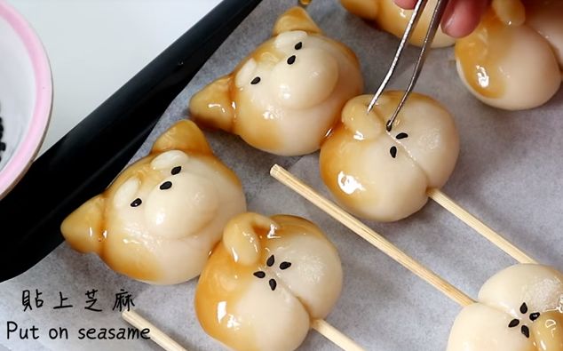 制作装饰:①在狗狗汤圆需上色处,刷上调味酱。