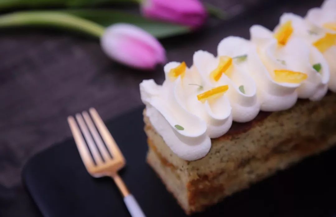 ⑦放入预热好的烤箱中层,以上下管180摄氏度,烘烤38分钟左右,烤完后取出晾凉、脱模。(如果不急着吃,建议用保鲜膜包裹后冷藏回油1-2天再取出食用,装饰用的淡奶油在食用前再打就可以咯!)制作装饰:①淡奶油加5g糖粉,打至6分发,即几乎不流动,但仍有轻微流动性的状态。②裱花袋装入合适的花嘴(下图使用圣安娜花嘴),再填入奶油霜。切去蛋糕四边(切边是为了可以直接看到柚子酱夹层,不切边也是可以的~),将奶油霜画Z字型挤在蛋糕表面装饰即可。