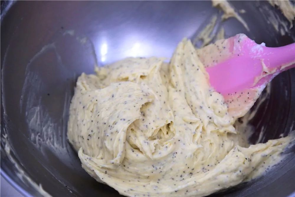 ⑤蛋白霜分三次加入黄油面糊中,每次都需翻拌均匀再加下一次,直至完全拌匀。