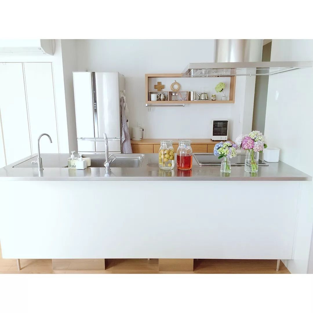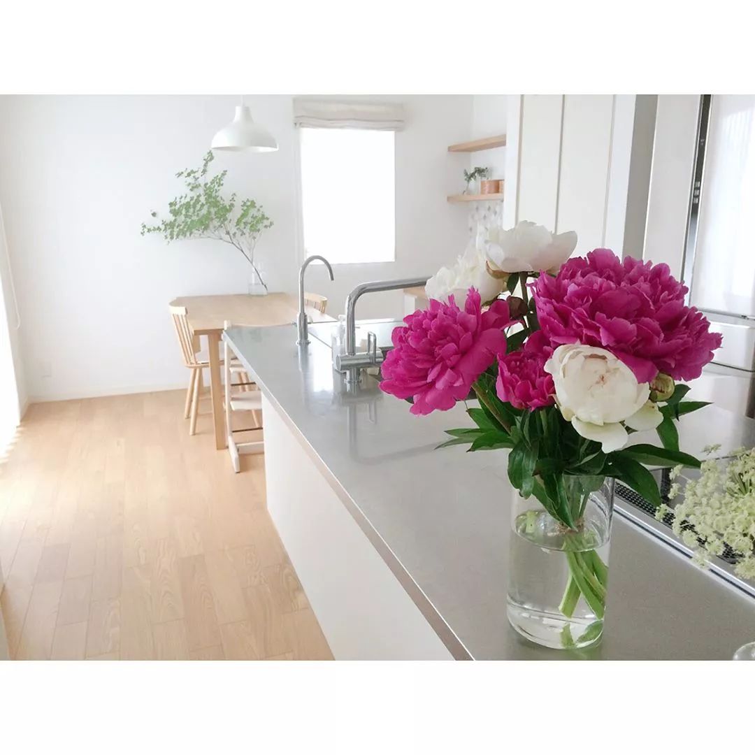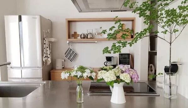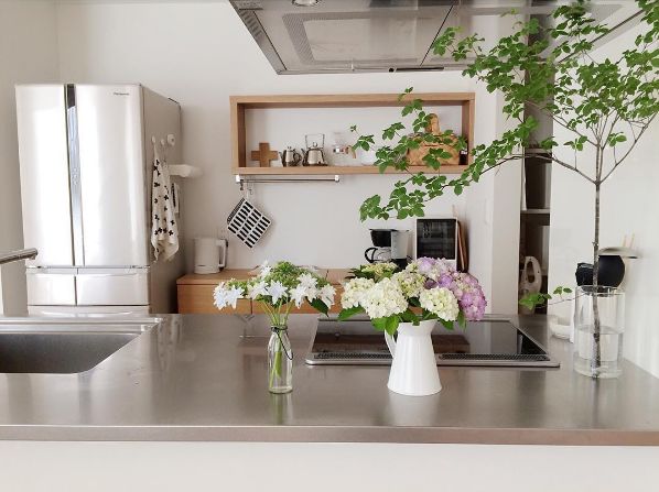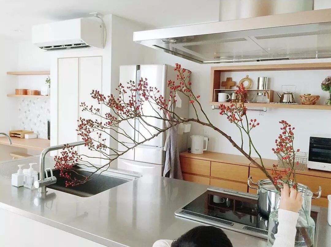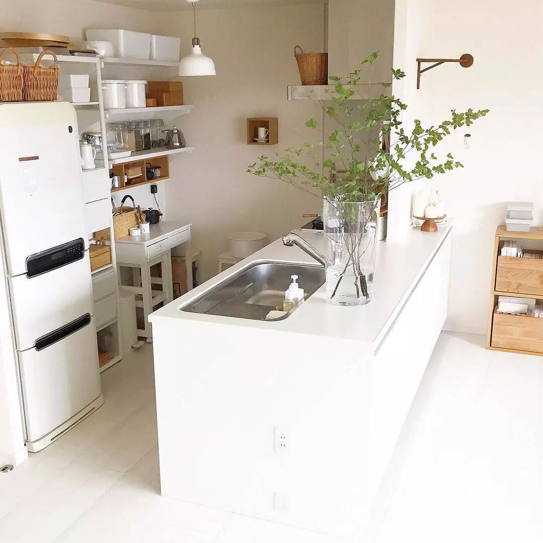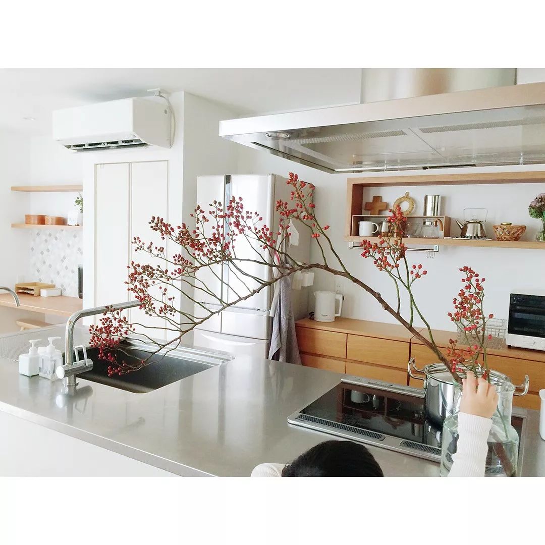 日本主妇尤其擅长收纳,甚至会把收纳本身作为一个爱好。但凡是收纳爱好者,一定听过整理女王麻理惠的名字,她的《怦然心动的人生整理魔法》可以说启发了无数人(当然也包括我)。不过今天要跟大家分享的是另外两位日本太太的厨房~❶厨房里没有任何杂物只有大把的鲜花绿叶第一位是ins上的日本收纳红人nika.home,她凭借自己收拾得井井有条的家收获了十余万粉丝。她的厨房跟别人家最大的不同之处,就是永远有最新鲜的插花点缀。nika的厨房杂物都收纳得条理,甚至整洁到有人会觉得没有烟火气(“咦,整洁成这样的厨房一定不做饭吧?”),但是厨房里的绿叶却很好地弥补了这点,有生命的花草给厨房带来了生机和清新~