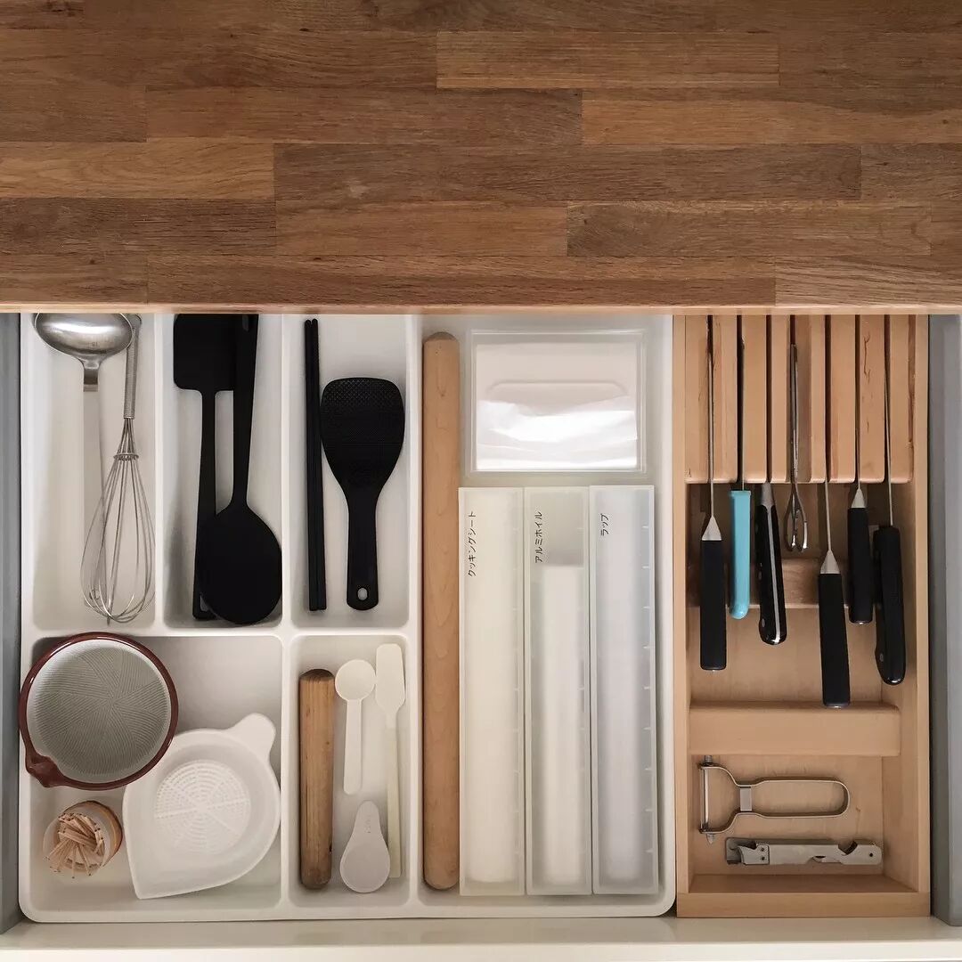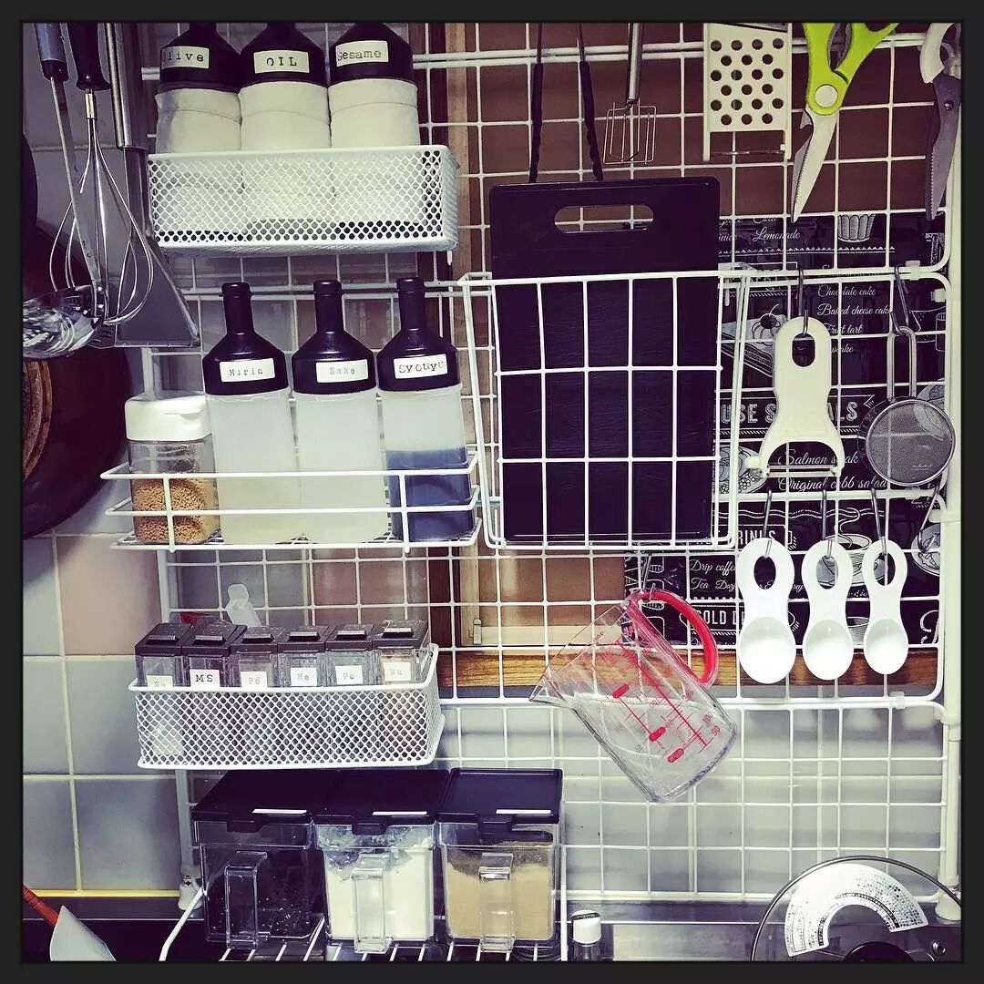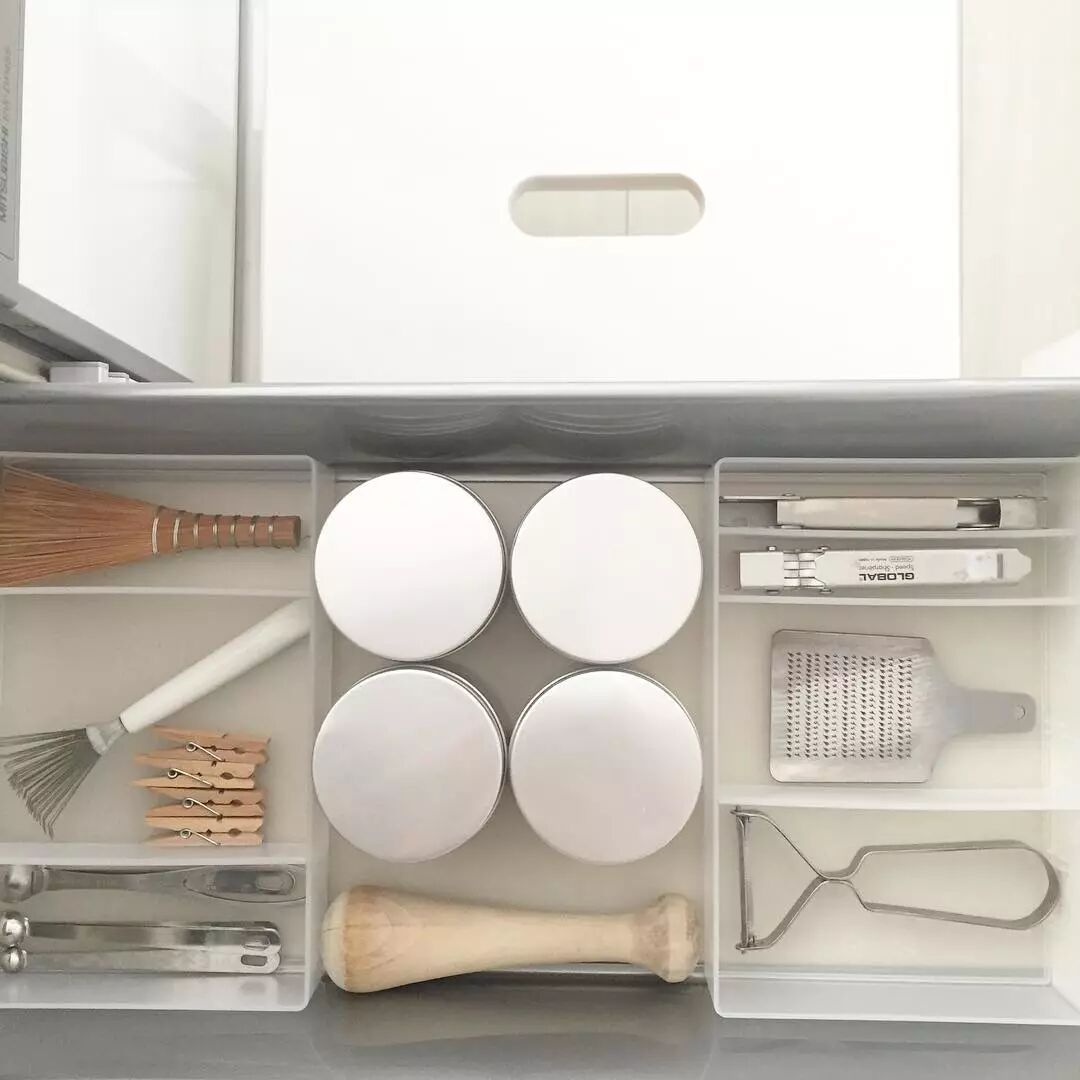 购买搜索关键字:厨房抽屉收纳 自由组合厨房抽屉分隔 隔板工具的手柄上大多都留有用于悬挂的小孔,对付粉筛、厨师机搅拌浆等不规则的小工具,借助不锈钢管(或免打孔伸缩管)和小勾子把它们挂起来简直太合适!