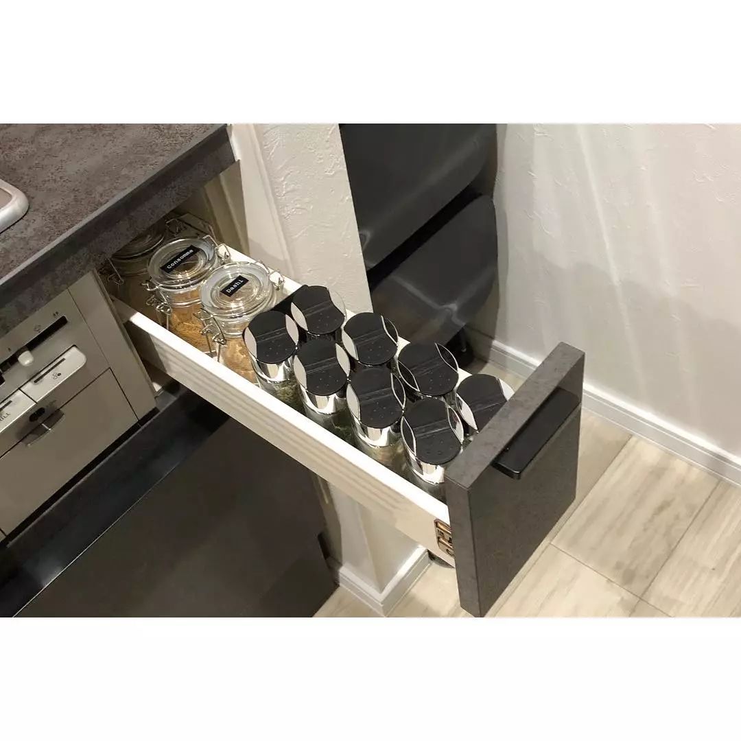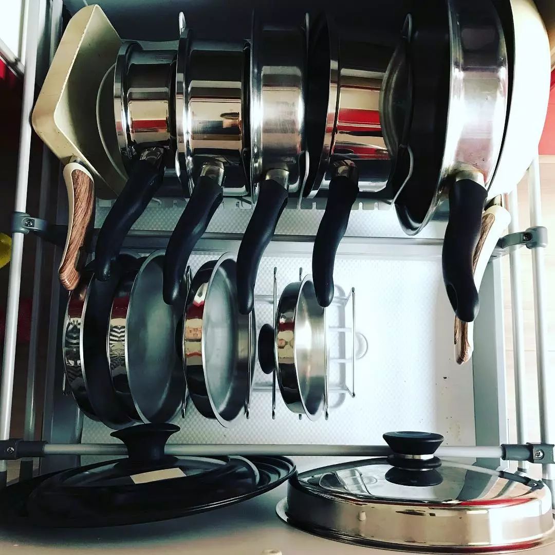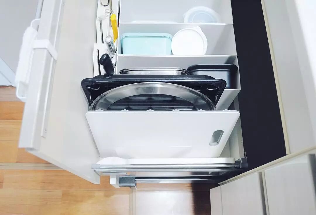 购买搜索关键字:厨房抽屉收纳 自由组合厨房抽屉分隔 隔板工具的手柄上大多都留有用于悬挂的小孔,对付粉筛、厨师机搅拌浆等不规则的小工具,借助不锈钢管(或免打孔伸缩管)和小勾子把它们挂起来简直太合适!