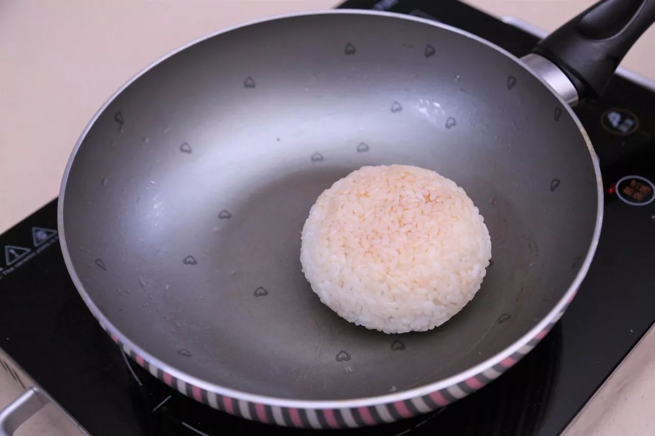 ⑤在饭团表面刷上一层酱汁,放入加了少许食用油的平底锅中煎至表面微焦上色,就可以开吃啦!(如果想让饭团内的芝士更软些,可以中火微波半分钟,或烤箱120度烤3-5分钟)