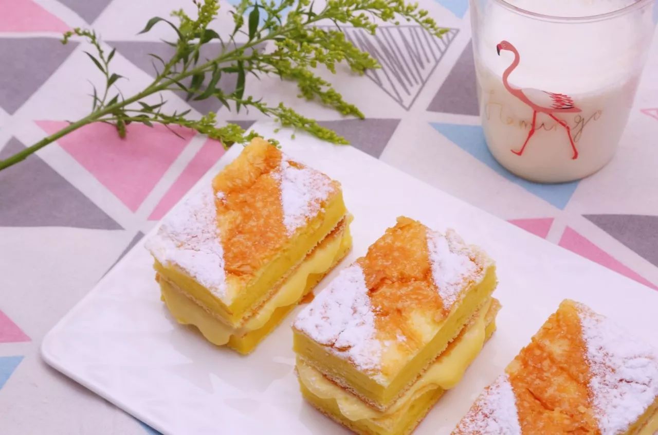 ④挤好芝士卡仕达酱后,盖上另一片蛋糕片,以糖粉装饰即可。