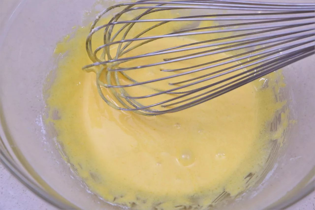 ⑦取1/3面糊放入牛奶黄油液中搅匀,再倒回面糊中翻拌均匀。
