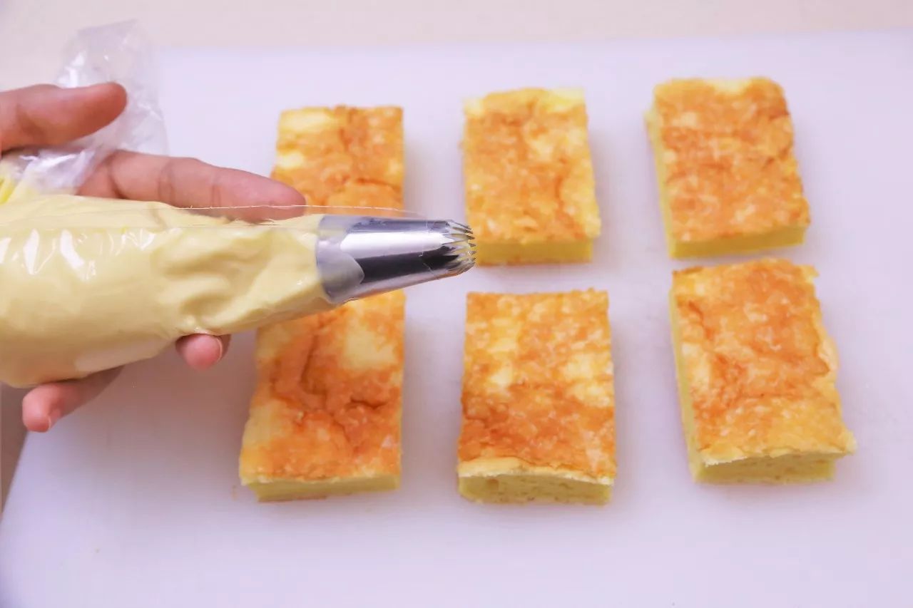 ③取出冷藏的芝士卡仕达酱,填入装好裱花嘴的裱花袋,在蛋糕片上挤出一个个小坨坨。