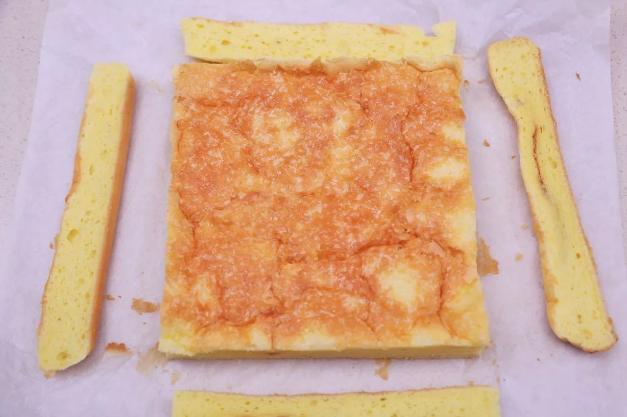 组装:①取出烤好的蛋糕,脱模并撕掉油纸晾凉。