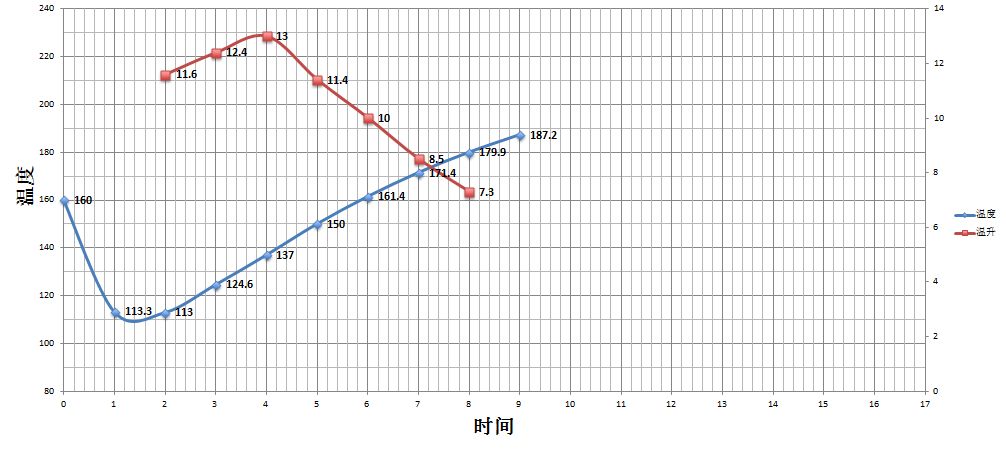 烘焙机杨家800N(烘焙量300克)炉温160℃入锅,火力100,风门开设3;回温点1'37",炉温140℃时将风门开至4,火力不变;炉温153.6℃时豆表变为黄色,青草味完全消失,进入脱水阶段,当炉温到达176℃时,将火力调至80度,风门不变;