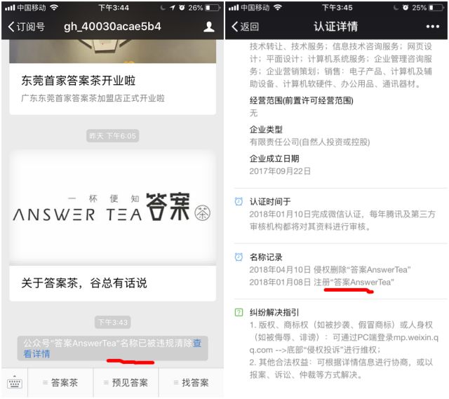 4月10日,“网红茶饮”品牌答案茶因涉嫌侵权注册,“官方”公众号名称被微信团队清除。目前,在微信搜索“答案茶”相关公众号,已无法搜到该账号。而这距其“答案茶2.0”全球品牌战略暨新品发布会,不过半个月光景。