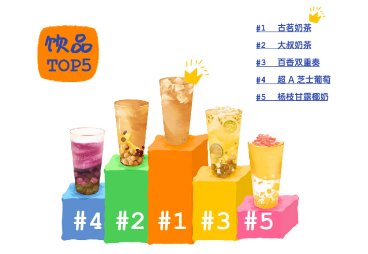 饮品总销量TOP5依次为:古茗奶茶,大叔奶茶,百香双重奏,超A芝士葡萄,杨枝甘露椰奶。