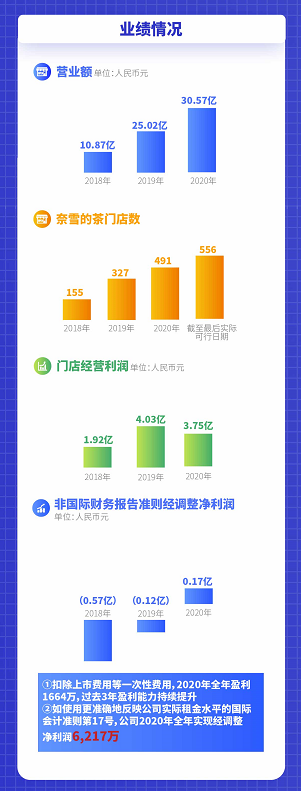 招股书显示,在非国际财务报告准则下,奈雪的茶2020年全年经调整净利润达1,664万,2019年这一数据为亏损1,174万,实现扭亏为盈。而按照国际会计准则第17号,奈雪的茶2020年全年实现净利润6217万。