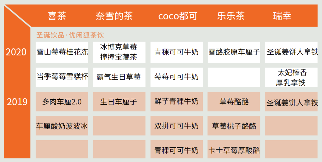 奈雪和喜茶在19年的时候喜欢用车厘子,那时候刚好车厘子价格大跳水,导致成本不至于过于昂贵,20年普遍用草莓,都突出的就是一个圣诞红。乐乐茶则和它们错开了这个市场的竞争,COCO坚持用可可作为圣诞主推饮品。
