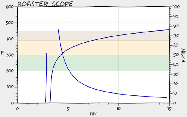 Scott Rao强调的是一爆开後RoR出现Crash/Flick的现象。如果用自然烘焙曲线来演绎,当豆温贴着自然对数曲线走时,它的RoR就是平顺向右滑降的形状,如下图(Artisan举例的图)