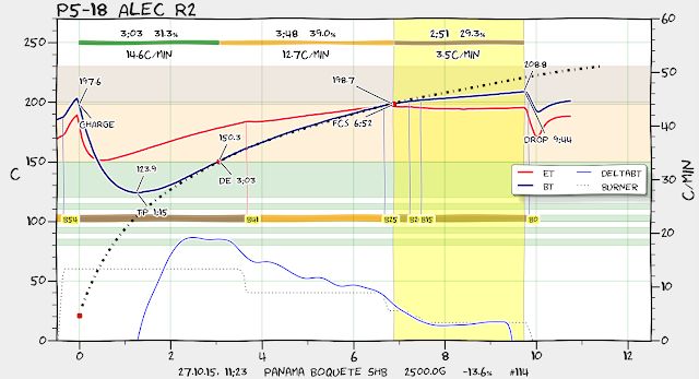 拿上图红色的曲线[B]对照Alec的冠军曲线图,是否发现到和黑色虚线表示的烘豆自然曲线很类似? [B]曲线就是化学反应生成物的自然曲线,和自然对数曲线ln()相吻合。 这样子比对有意义吗?是说和自然曲线吻合度高的,代表他的烘焙品质比较好,还是说自然曲线可以作为我们事後检讨时一个重要参考? Artisan软体的创作者Marko Luther在Blogger上说明他把自然对数曲线加入Artisan v.0.9.8的原因,一开头就说了 People typically talk about the art of coffee roasting. We're interested in the science. Therefore, we keep adding features to Artisan that allow to analyze and compare roasts. 人们总是谈论咖啡烘焙的艺术,而我们的兴趣是科学,因此,我们持续把可以用来分析、比较每一次烘焙的功能加到Artisan上。 固定风火烘焙时,豆温以及RoR曲线会像这样(下图蓝色的曲线)