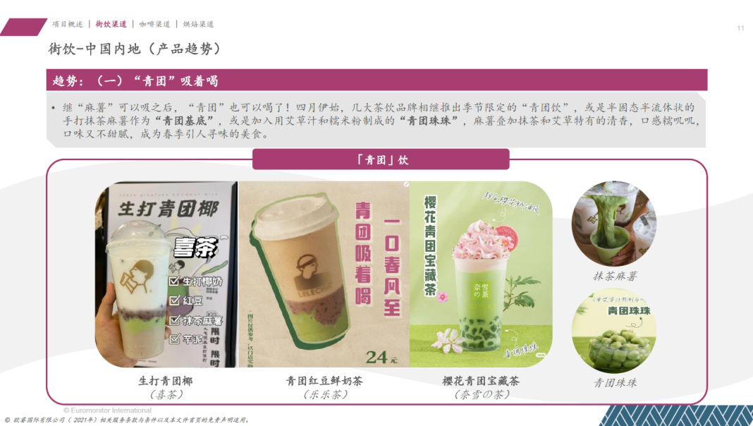 如喜茶的生打青团椰、乐乐茶推出的青团红豆鲜奶茶、奈雪的樱花青团宝藏茶等。