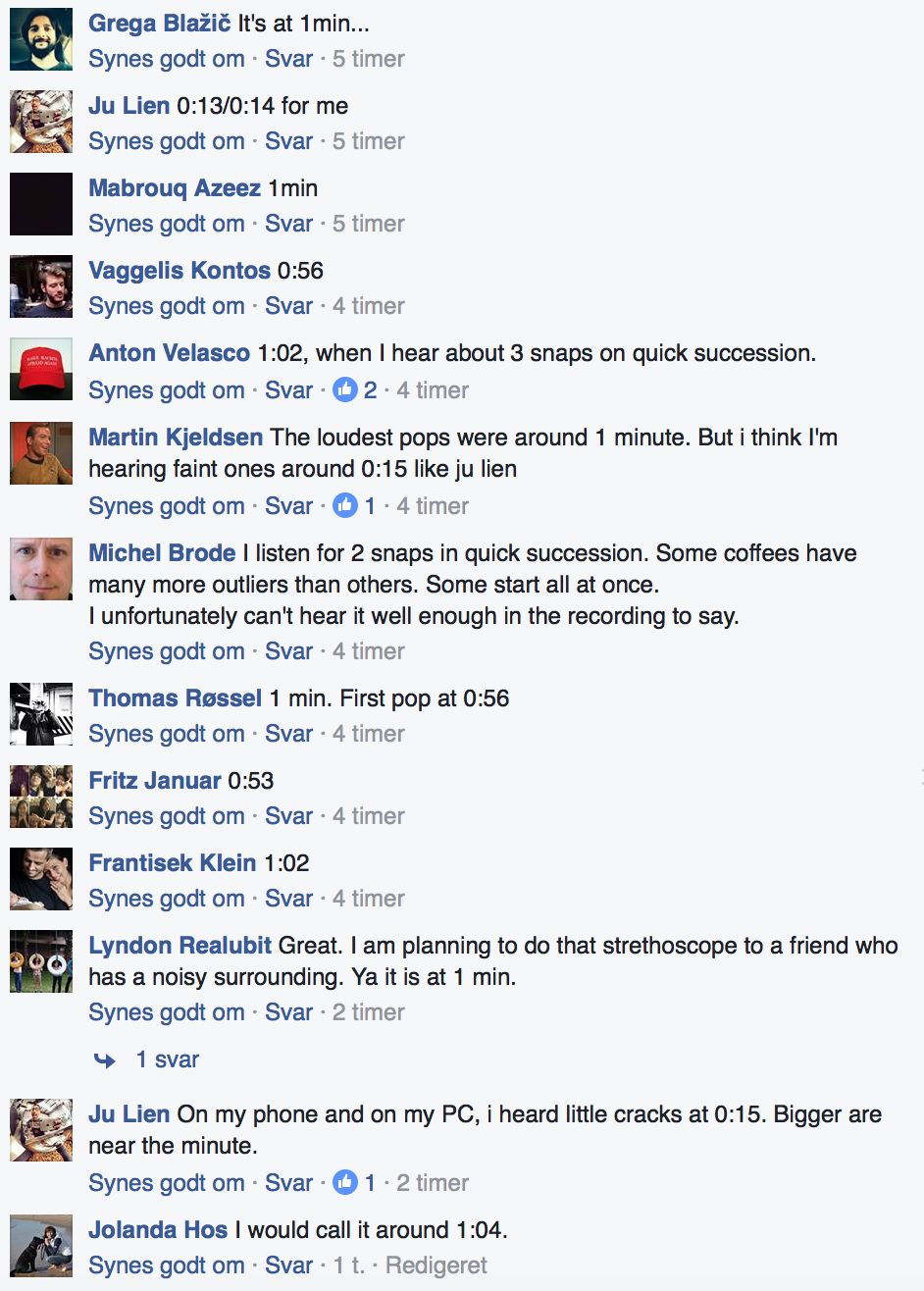 另一个让确定“一爆点”变得非常困难的因素是背景噪音: 烘焙机运转的噪音和豆子敲在锅炉壁上的撞击声。所以实际烘焙中会很难听清楚爆裂的声音。 不信?来试一下听听下面的这段录音。你可以看着时间记录一下一爆点。