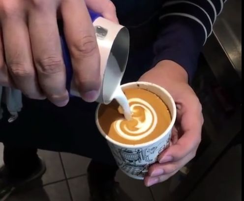 关键点:高度和倾斜 在外带杯拉花之前,需要让奶泡与意式浓缩咖啡先融为一体。一开始倒入咖啡时,要从距离咖啡表面约5公分的高度,将奶泡倾斜融合倒入咖啡中,此时,奶泡与意式浓缩咖啡就自然而然地融为一体。你会发现,咖啡颜色慢慢变浅的时候,就可以绕圈,与咖啡相融。正面|压纹步骤:摆动,增加奶泡的流量