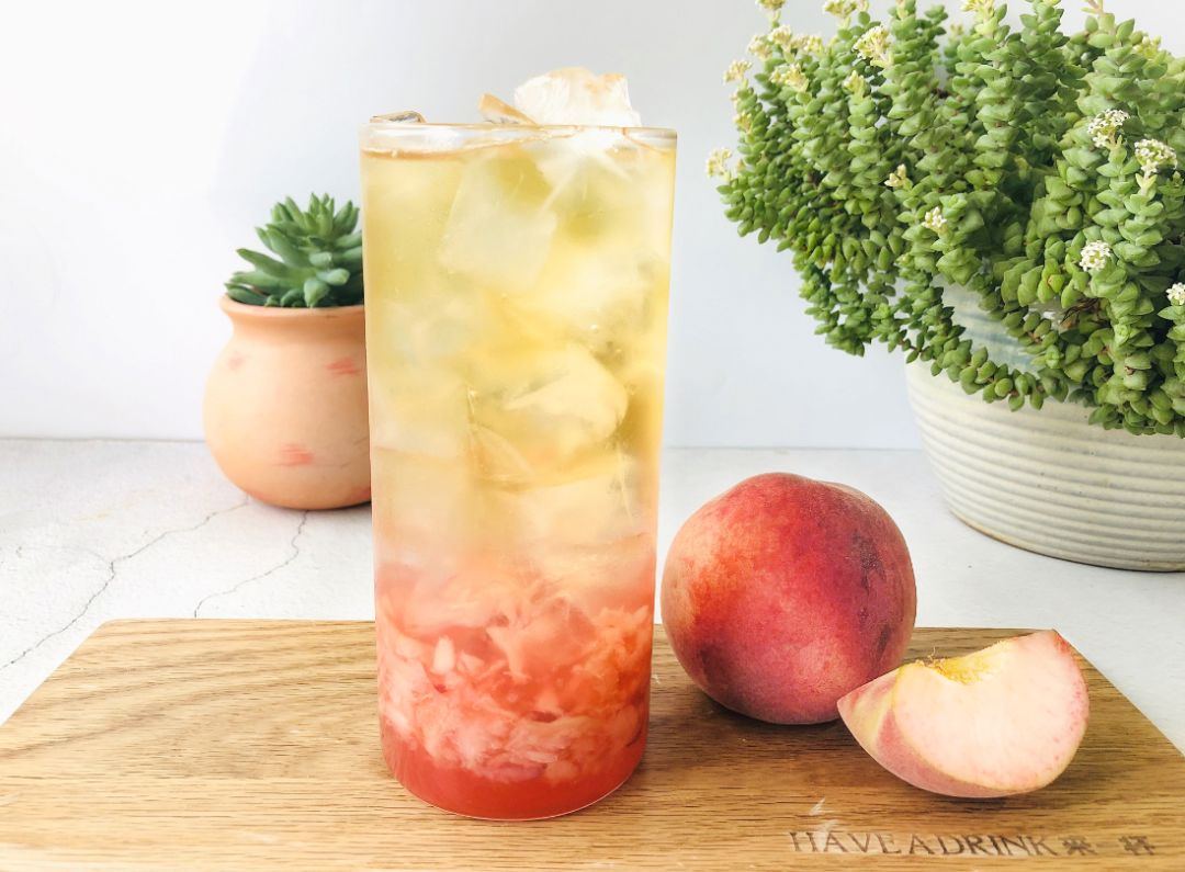 桃子的处理上,不建议采用沙冰机打碎,可以挑选熟透的水蜜桃进行薄皮碾压处理,提前碾压好的蜜桃可以采用果糖/冰糖蜜汁处理,既可以提高口感又可以保质防腐。