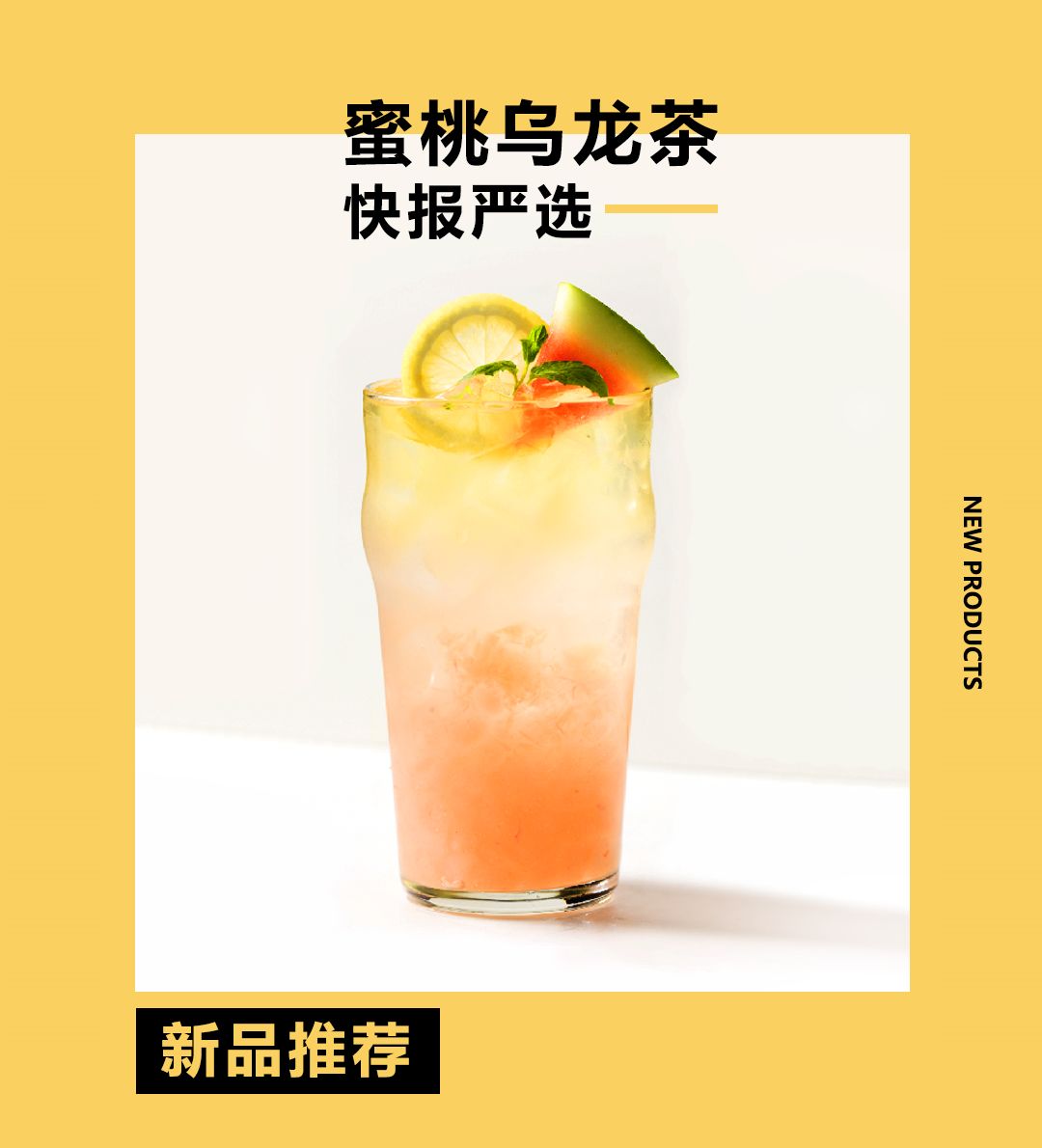 蜜桃乌龙茶配方:美名氏水蜜桃蓉50g、桃李林水蜜桃泥20g、美名氏四季春茶汤200g、美名氏果糖20g、冰块200g、黄柠2片制作流程:
