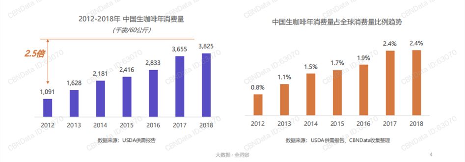 2018年生咖啡年消费量提升250%中国生咖啡消费量不断增长 ,相比2012年,2018年生咖啡年消费量提升250%,尽管体量仅占全球咖啡消费量的2.4%,但中国咖啡消费量年增长颇具势能,中国消费者对咖啡的需求不断提升。