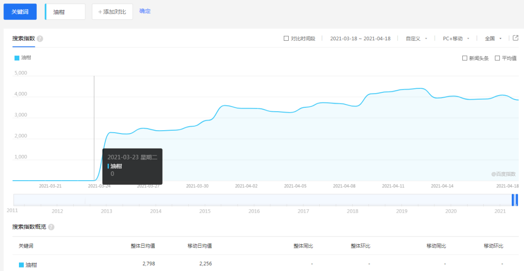 从百度指数的数据也可以看出,3月23日奈雪推出“霸气玉油柑”以前,人们对“油柑”的关注度基本为0,之后热度呈直线型猛增。