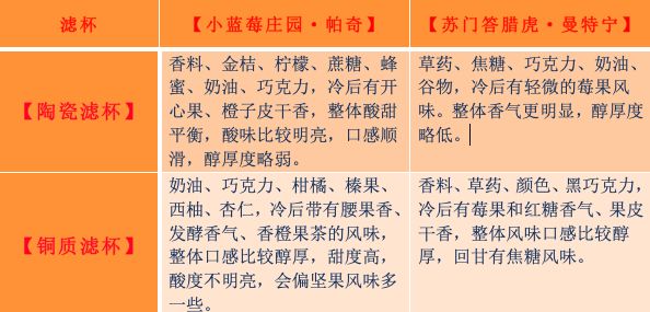 总体感觉【铜质】的滤杯萃取出来的口感会更加醇厚,甜味较高,坚果风味明显;【陶瓷】滤杯的香气会更加明显,酸甜会更加均衡。【铜质】滤杯的口感醇厚原因可能是它的流量会比较慢,咖啡粉处在浸泡的时间比较长,萃取率较高;而且其保温性比较差所以芳香物质的分子运动较少香气较弱。【陶瓷】滤杯的香气更加明显正好于【铜质】滤杯相反,是因为它的保温性好,芬芳物质的分子受热往上漂,运动更加激烈所以其香气更加的突出;它的流量相对于【铜质】的快一些,所以萃取率较低,萃取出来多以水果风味的,而活动性较弱的坚果风味分子萃取的较少,因而造成了【陶瓷】的滤杯酸甜感更好。