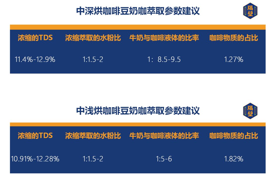 温馨提示 在本文的测试中,我们的重点有两个1、以两种烘焙度的咖啡豆为主展开测试,探究不同咖啡占比情况下,奶咖的口感表现。2、以及对奶咖的出品建议(包括堂食和外带打包)本期使用了具有代表性的两个烘焙度的咖啡豆进行测试,在浓缩萃取上我们会固定使用的咖啡粉量和萃取时间,然后分别使用四个不同的粉水比进行萃取。考虑到咖啡店的奶咖出品会以中深烘和中浅烘为主,所以依旧选了这两种烘焙度的变量。再通过不同的研磨度搭配不同的粉水比来使得浓缩浓度和萃取率产生变化。
