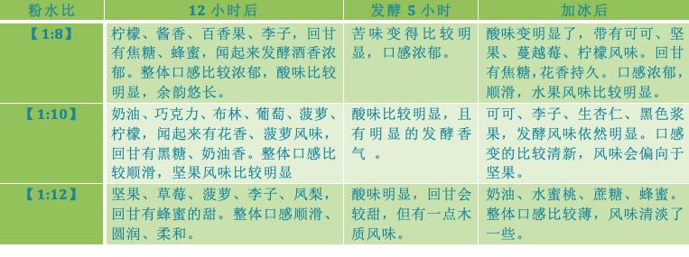 【粉水比1:8 | 30克粉: 240克水】苦味变得比较明显,口感浓郁。【粉水比1:10 | 30克粉: 300克水】酸味比较明显,且有明显的发酵香气。【粉水比1:12 | 30克粉: 360克水】酸味明显,回甘会较甜,但有一点木质风味。