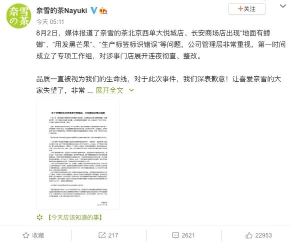 到了2021年8月,新华社更是报道出某几家奈雪门店出现原材料编制,卫生环境脏乱等问题引发了舆论与关注。据报道指出,这些门店存在蟑螂乱爬,抹布不洗,标签时间不实等问题。而奈雪公司在报道出现后,也只是私下处理,并未给消费者们作出“交代”。于是新华社继续“爆瓜”,指出有门店在水果已经出现腐烂的情况下,员工削掉后继续使用的问题…新闻一出,网友们直接炸锅!奈雪公司也立马连夜调查与整改涉事的门店,同时邀请市场监管部门上门检查,并第一时间公布的了检查结果。