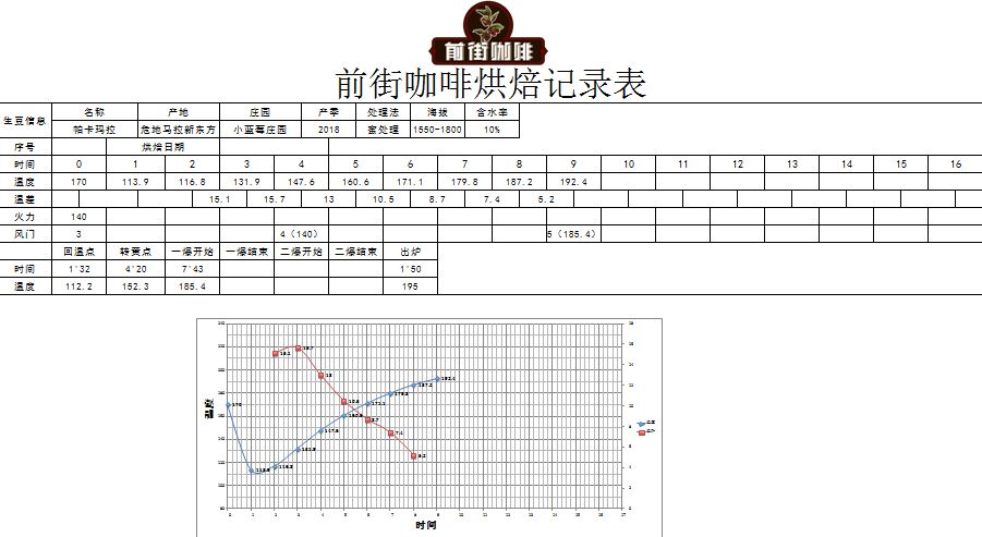 烘焙机杨家800N半直火(烘焙量300g)炉温预热至170℃入锅,风门开设3,火力140;回温点1'32",温度是112.2;140℃时火力不变,风门开到4。5分钟转黄,青草味消失,进入脱水阶段,火力不变,风门保持4。