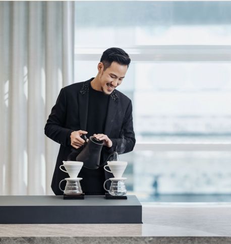 不同于大多数的咖啡师,全力倾注精神在杯里,王策更在乎的是饮用者的身心灵感受。观赏他获得冠军的影片时,除了流畅的英文以及温暖的声调,让人感到安心外,每一个环节都紧扣著“服务”,在后台将滤纸先沾湿,是因为他深知,透过冷的陶瓷能增加咖啡液的香气,与将磨好的咖啡粉密封在黑色玻璃罐内,减低氧化速度,再加上事先温杯,预先准备咖啡豆资料(包含产区、烘焙程度、风味表现等)等,都是“想在客人之前”的具体表现,这不只满足味觉与嗅觉的感受,更是综合五感的极致表现。