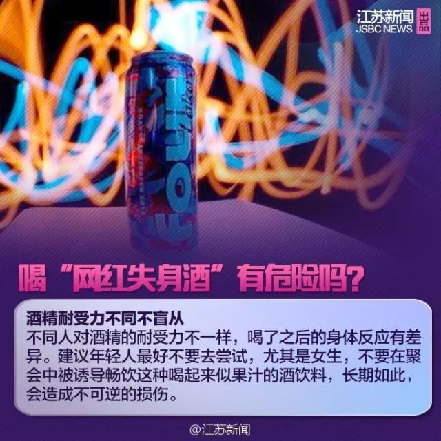 近日,一款被称为 “失身酒”的酒精饮料Four Loko在走红。外表看似果味饮料,但实际酒力强劲,一罐就“断片儿”。南京四女生跟风挑战,险遭抢都浑然不知。