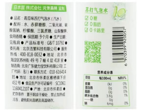 要知道,元气森林可是靠着”0糖、0脂、0卡“招牌气泡水火爆全网的。真的无糖吗?根据中国《预包装食品营养标签通则》,食品中的糖含量少于0.5g/100g(固体)或100ml(液体) ,即可标注为“无糖食品”。