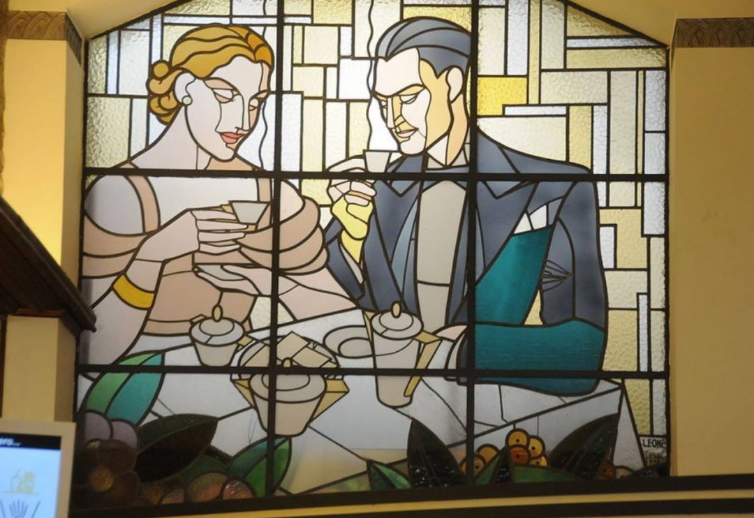 帝国咖啡厅时期的彩色玻璃至今仍保留,玻璃上的图案是从种植到享用一杯咖啡的过程介绍。装饰风格的彩色玻璃。(图片来源:Dinheiro Vivo网站)