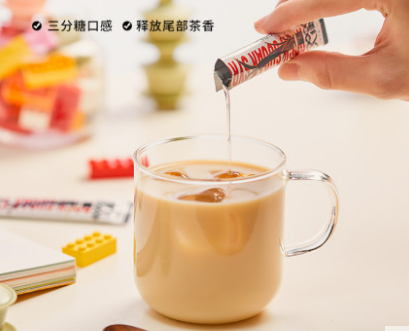 利用萃取冻干技术,将茶叶加工成超细茶粉,顾客只需用冷水就能冲泡成一杯茶汤,如果加上该品牌附赠的小袋装蔗糖浆,再勾兑牛奶等物料,就能在家做出一杯跟奶茶店口感相当的奶茶。