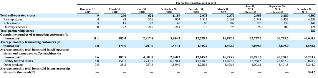 瑞幸咖啡利润数据从门店开店情况上,根据瑞幸咖啡最新公告消息,截止今年6月底,瑞幸全国门店数已超过5200家,其中财报数据显示,2017年瑞幸咖啡门店数量为9家,2018年为2073家,2019年为4507家。在门店类型上,瑞幸咖啡的门店形态包括快取店、悠享店、外卖店三大类,这三大类门店中,「快取店」总数量占比最多。财报统计数据显示,2018年一季度至2019年底,瑞幸咖啡快取店门店数从83家增长至4239家,快取店占总门店数比例从前述期初的28.6%增长至2019年底的94.1%。