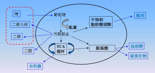 酵母代谢循环简易示意图 有趣的是在啤酒发酵过程当中,后期酵母依然嗷嗷待哺,这个时候可发酵糖或许已经消耗殆尽,各种发酵代谢物副产物都会变成酵母们的粮食。