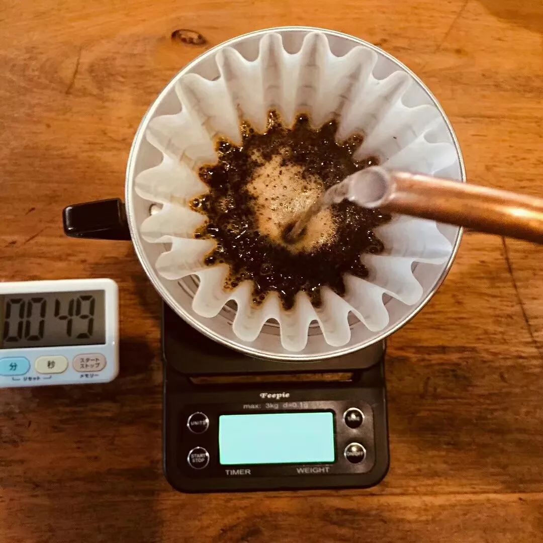下面以避光避湿阴凉保存了50天的【花魁】咖啡为例。使用蛋糕杯滤杯,水温87-88度(新鲜时用90~91度),水粉比1:15。