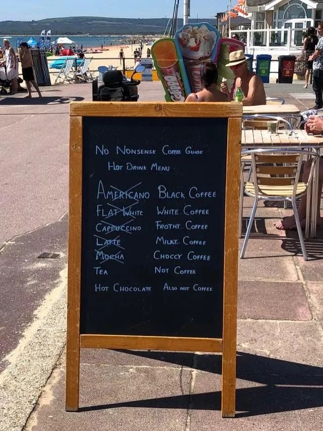 但你是否有想过,这些在咖啡爱好者眼内每一个名字都能引出一大串波澜壮阔凄美动人浪漫故事的咖啡名称,在那些非专业非资深的咖啡消费者眼内,究竟意味着什么? 近日,有一家富有黑色幽默精神的英国咖啡馆,就做出了一个“与众不同”的菜单指引,号称是「毫无废话的咖啡指南-热饮菜单」。被网友放上网后竟意外走红,并引发一大轮争议。