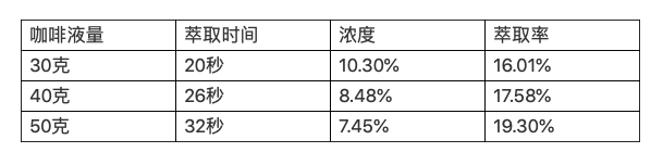 咖啡师分别萃取三组不同粉液比的浓缩咖啡,同样以20克的咖啡粉,第一组萃取30克咖啡液,即1:1.5的粉液比;第二组则是正常的萃取40克咖啡液,即1:2粉液比;第三组萃取50克的咖啡液,粉液比为1:2.5。粉液比带来最直接的影响是萃取时间的差异,萃取30克咖啡液的萃取时间为20秒,萃取40克咖啡液是26秒,萃取50克咖啡液是32秒。这样的结果是什么?时间短自然萃取不足,导致味道不完整,时间太长又容易萃取出太多的物质,例如让人联想到苦的物质。前街咖啡的咖啡用浓度测试仪分别测定三支不同粉液比的浓度,并分别计算萃取率。
