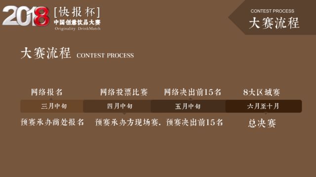 2018年我们将承接既有的成功经验,做出6大调整,让比赛更公平公正,让创意迸发,让选手获得更好的影响力(部分区域赛冠军已被连锁预定,总决赛冠军已有厂家预定为公司品牌推广大使)……