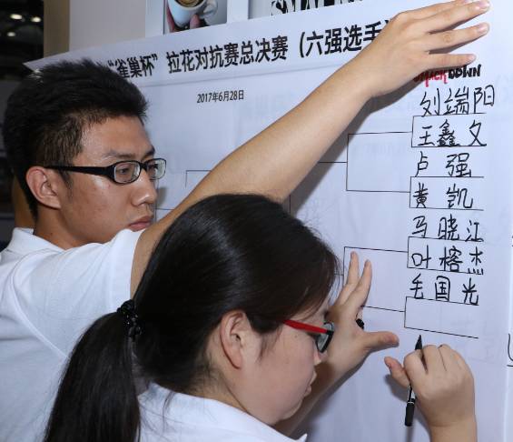 被“冰冻”了的赛场2017年雀巢杯拉花对抗赛历经3个月,走过了上海,杭州,漳州,成都,广州,北京等城市,终于来到了梦想终点站——全国总决赛,6月27-28日在北京国家会议中心,来自每个城市的前六名在这里进行了终极PK,最终决出了全国六强!雀巢杯全国总决赛TOP6第一名:马云鹏 (开封光影咖啡)第二名:黄凯 (GVSTB coffee)第三名:殷光辉 (北京漫咖啡)第四名:叶榕杰 (几克咖啡馆)第五名:毛国光 ( 可夫咖啡 )第六名:贡东佳 (上海咖啡梁啡 )