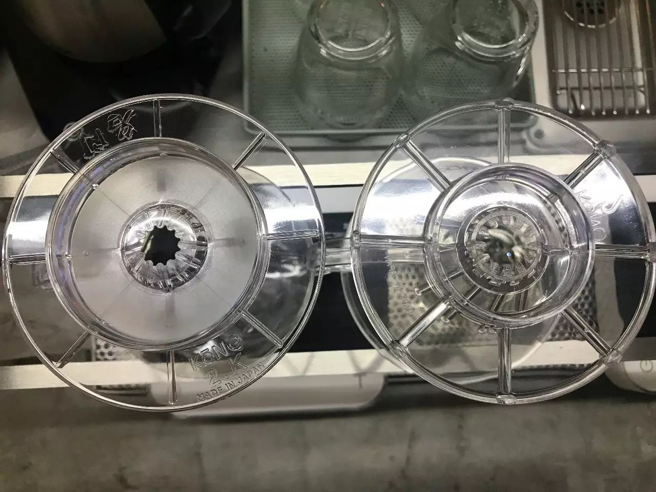 细心的朋友可能会发现KONO的滤杯其实会有两款不一样的设计,一款骨架稍长,底部开口稍大,另一款骨架较短,底部开口较小。首先河野雅信的设计,是滤纸首先不需要浸湿的情况下,利用骨架排气让焖蒸达到更好的效果,接下来在之后的冲煮中,水位上升,可以让滤纸紧贴杯壁达到控制气流空间以增加水和粉的浸泡时间。因此我们可以发现,KONO所生产的滤纸几乎为酸醋漂白滤纸,比较少出现树浆滤纸,这是为了咖啡师可以免去冲洗滤纸这个过程,使冲煮计划的构建更加灵活。