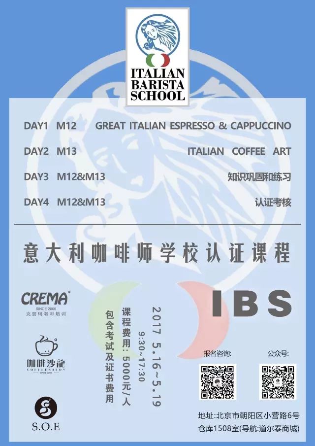 课程内容介绍正统道地的意大利咖啡厅的完整专业教育,课程中将使用北意至南意不同地域风格的咖啡豆来展现各自的特色。学习制作源于意大利的 Italian Caffè Art 技术并确保顾客能够从中获得最佳的感官体验。Day 1—— Great Italian Espresso & Cappuccino正统道地的意大利咖啡厅的完整专业教育,课程中将会使用四种不同地域风格的咖啡豆,展现它们各自的特色,学习 Espresso 和 Cappuccino等4款经典意大利咖啡饮品的制作技术。Day 2—— Italian Coffee Art八种源自于意大利的经典咖啡,各种饮品都有其感官地图,学习经典咖啡的艺术制作,并确保顾客能从中获得最佳的感官体验。通过后授与证书,欢迎一般咖啡爱好者,咖啡业者,咖啡烘焙,院校讲师参与。Day3 —— 知识巩固和练Day4 —— 认证考核上课相关须知----课程进行中请着浅色系上衣请勿使用香水等芳香物课前请正确饮食及睡眠课程时间:5月16日-5月19日上课时间:9:30-17:30课程费用:5000元/人(包含考试及证书费用)课程人数限制:10人本月 SCA 精品咖啡协会课程