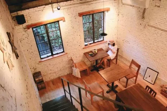 踩过一段嘎吱嘎吱的楼梯,二楼咖啡馆便显现出来。馆内高挑宽敞,白色砖墙粗漆做旧,这是八十年代的上海老民居改造而成。