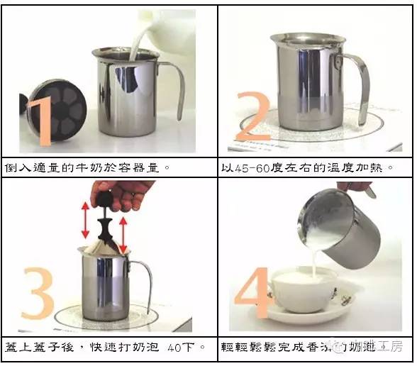 手动打奶器 貌似这款器具在咖啡馆中也是很常见的,尤其是夏天在制作冰拿铁或是冰卡布的时候,多数咖啡馆也是使用手动打奶器来打奶泡。如果熟练掌握,还能打发出支持拉花的奶泡哦。使用方法是倒入1/3的牛奶,然后上下抽动那个拉杆,然后依据牛奶发泡程度来调节自已使用器具时需要抽动的次数,简单易用。也有朋友使用法压壶来打奶泡,其原理是差不多的。