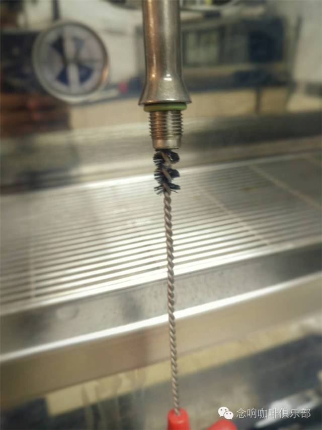 图片上接触处绿色的是密封胶圈,请保留好!有些机器型号是没有这个胶圈的。蒸汽头链接的螺纹里会堆积很多奶渍,先用稍微湿点的抹布擦拭一下,如果无法清除,可以用我们的“清洁液”再次浸泡3分钟!螺纹里如果不好擦,可以用一种纳米毛巾顺时针去转着擦拭,可以用点力气。最终的目的就是处理干净!- 4 -螺纹里处理干净后,我们用咖啡机蒸汽喷枪清洁刷伸入到蒸汽枪内部,伸到最顶部,上下转动,蒸汽刷会让蒸汽枪内壁上的奶渍脱落。