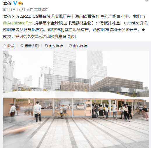 事实上,喜茶作为一家常年排长龙的网红茶饮店,其知名度本来就很高,而%ARABICA的知名度在国内外也获得很多好评,不难想象,此次联名开快闪店同样也是一家刷爆社交平台的网红店,大排长龙的景象又要上演了!